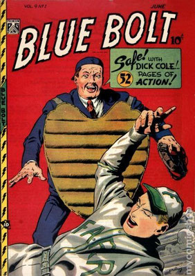 Anche il magazine “Blue Bolt” della Novelty Press nel 1948 cercò di veicolare l’eroe della casa editrice, Dick Cole, nel mondo del Baseball ma al pubblico dei lettori, grandi e/o piccoli, non piaceva la fantasia che guidava la mano alle matite dei vari autori quanto invece piacevano le toccanti sceneggiature di quei tanti atleti che avevano avuto il pregio e la fortuna di accasarsi nelle franchigie della Major League e le vicissitudini interne dei club stessi.